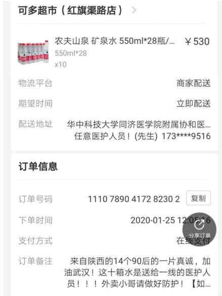 1月23日,疫情蔓延呈上漲趨勢(shì),武漢“封城”后物資匱乏,各地各鎮(zhèn)府人民紛紛送去了物資力量,中陜核集團(tuán)核昌黨委工作部幾位青年們亦立即行動(dòng)起來(lái),通過(guò)朋友圈、微信群、QQ群等渠道,組織號(hào)召朋友、家人參與進(jìn)來(lái),開(kāi)展捐款購(gòu)買礦泉水活動(dòng),送往武漢華中科技大學(xué)同濟(jì)醫(yī)學(xué)院附屬協(xié)和醫(yī)院金銀湖分院,大家快速行動(dòng),活動(dòng)共捐助10箱280瓶礦泉水。小小的280瓶,帶著核昌青年及家人朋友對(duì)武漢同胞的祝福、對(duì)全體一線奮戰(zhàn)醫(yī)務(wù)人員的敬意、對(duì)國(guó)家抗擊疫情成功的信心前去抗疫一線,這份小小的力量有我們大大的祝福,希望能幫到他們,盼望正在一線奮斗患者和醫(yī)務(wù)人員都能平安歸來(lái)。